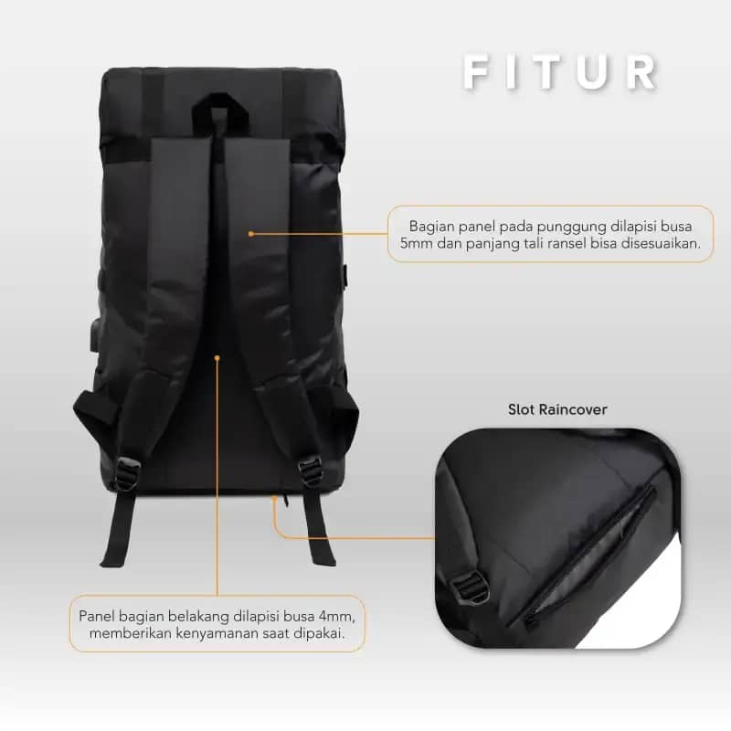 - Raincover Bonus: Dilengkapi slot khusus di bagian bawah untuk raincover anti air, melindungi barang-barang Anda dari hujan.