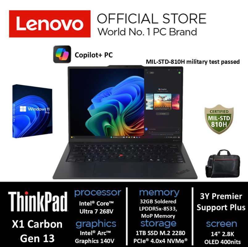 Rasakan daya tahan dan portabilitas dengan LENOVO ThinkPad X1 Carbon Gen 13, teman ideal bagi mereka yang memerlukan kombinasi kinerja dan kenyamanan.