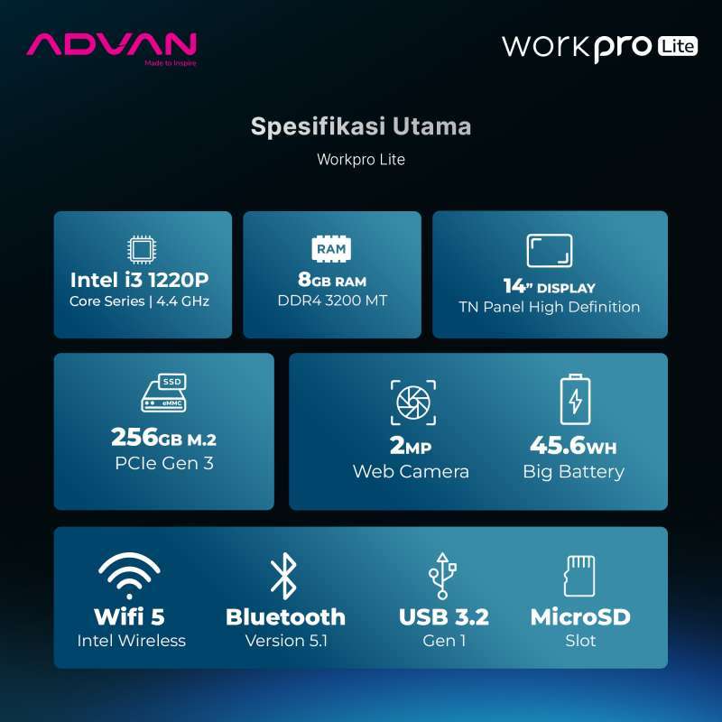Keunggulan lainnya meliputi fitur kamera HD 720p dengan penutup privasi dan baterai berkapasitas besar 45.6Wh, cukup untuk aktivitas sehari penuh tanpa sering diisi ulang. Port yang beragam memastikan konektivitas mudah, dan komponen yang dapat di-upgrade memungkinkan peningkatan performa sesuai kebutuhan. Cocok untuk pelajar, pekerja, dan profesional kreatif, ADVAN Workpro Lite adalah solusi tepat untuk mendukung produktivitas sehari-hari Anda.